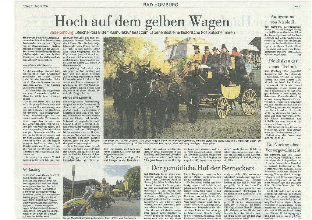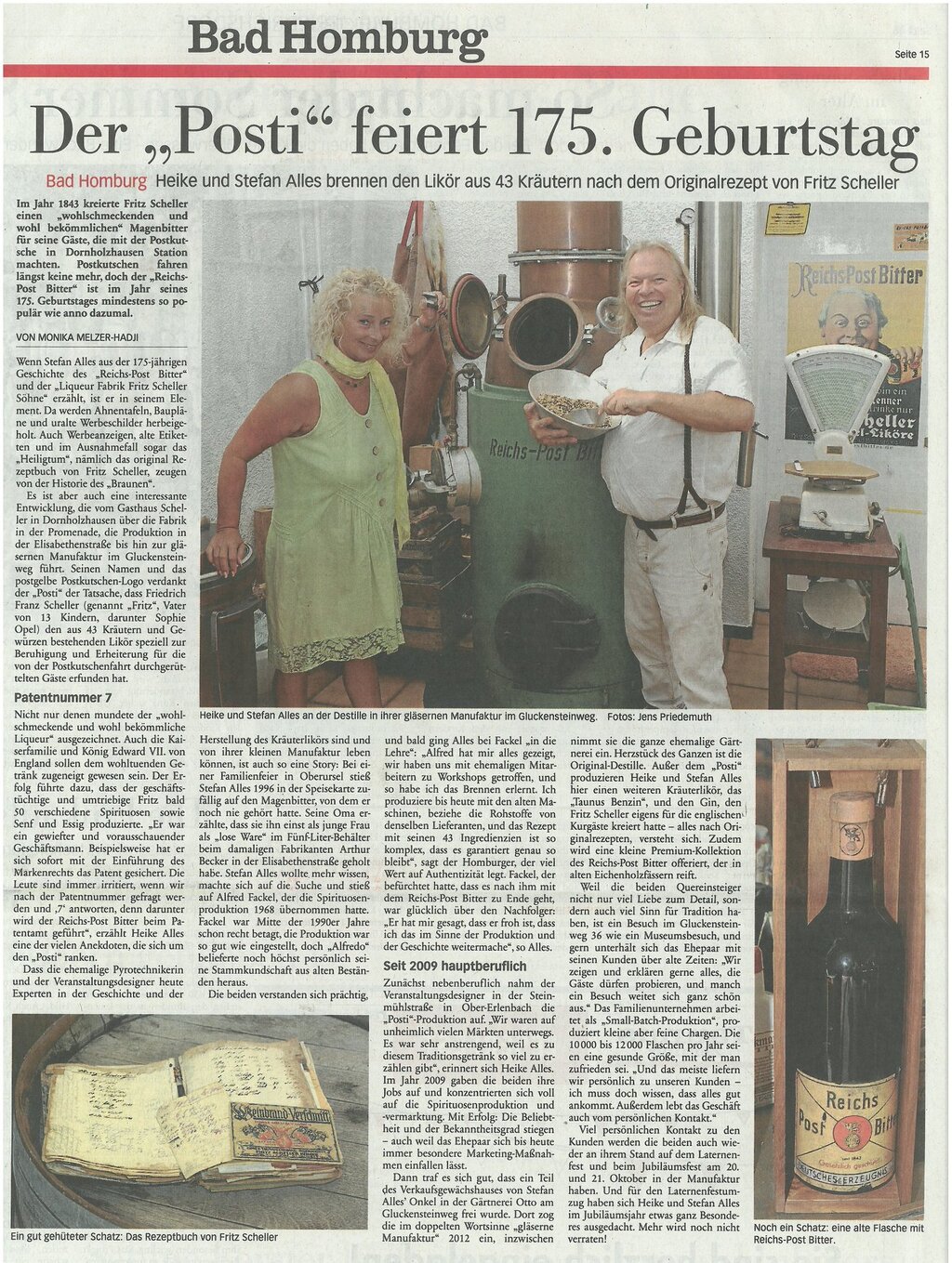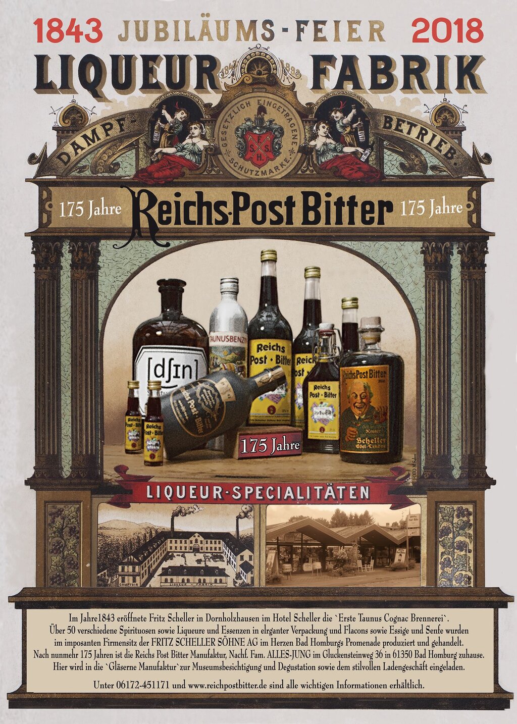 1843-2018 Fritz Scheller Söhne mit REICHS POST BITTER und vielen weiteren Spirituosen Spezialitäten. Seit 175 Jahren in unserer wunderschönen Stadt Bad Homburg. Wir feiern gerne mit Euch, Jubilieren und Tirilieren das ganze Jahr 2018.